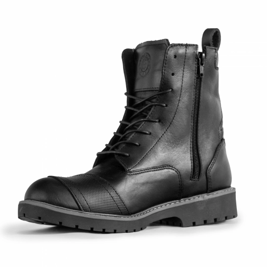 La bota Royal Vintage para motociclistas combina un estilo vintage con un diseño vanguardista. fabricada en cuero natural 100% garantizado. Cuenta con una pieza protectora en la puntera de cuero grabado para los cambios, cordones planos encerados. textiles internos con características antimicrobianas, suela en caucho antideslizante. Cuenta con plantilla semi ortopédica ofreciendo comodidad, el cuello y el protector de tobillo abullonados de la bota proporcionan flexibilidad y protección adicionales. Además, presenta un elegante grabado lateral en láser en su parte externa.